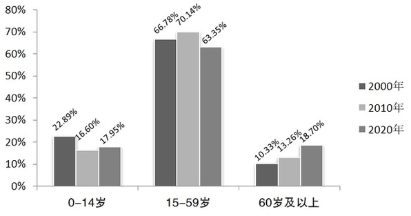 从全国人口年龄结构看,在2000年、2010年和2020年三个全国人口普查年份,0-14岁人口占比分别为22.89%、16.60%和17.95%,呈现先明显下降、后有所回升的态势;15-59岁人口占比分别为66.78%、70.14%和63.35%,呈现先有所上升、后明显下降的态势;60岁及以上人口分别为10.33%、13.26%和18.70%,呈现持续上升、加速上升的态势。总体而言,21世纪前20年,少儿人口占比和劳动年龄人口占比均下降,老年人口占比明显上升(见图2)。