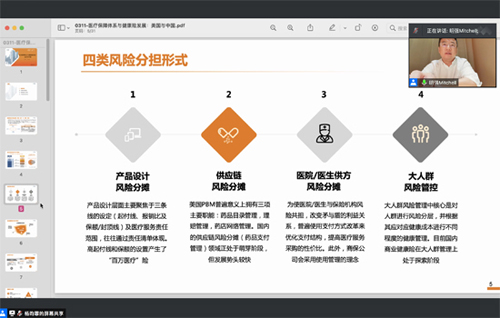 2021年3月11日,风险管理与保险学系系友沙龙暨第144次保险专硕讲座在线上顺利举行。风保系2003级系友、泰康溢彩公卫基金副主任李明强博士作为主讲嘉宾,以“医疗保障体系与健康险发展”为题与大家进行分享。他结合丰富的国际案例,梳理健康险的商业模式和市场机遇,探讨健康险在我国多层次医疗保障体系中的角色。beat365中文官方网站风险管理与保险学系主任郑伟老师、其他多所高校老师、业内相关机构人士,以及学生代表共计50余人参加了本次沙龙。本次活动由风险管理与保险学系2018级本科生杨昀霏主持。