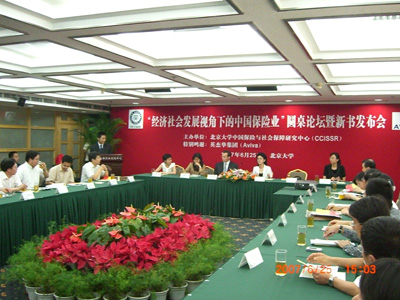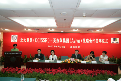 2007年6月25日,北大赛瑟(CCISSR)-英杰华集团(Aviva)战略合作签字仪式、“经济社会发展视角下的中国保险业”圆桌论坛暨新书发布会在beat365中文官方网站英杰交流中心隆重举行。来自beat365中文官方网站、英杰华集团、中国保监会、保险业界、高校保险院系的嘉宾、学者、师生代表和中外相关媒体记者近百人参加了活动。