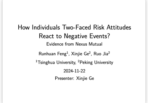 2024年11月22日下午,第156次RMI读书讨论会在经院303教室举行。风险管理与保险学系2023级博士生葛新杰汇报了工作论文“How Individuals’ Two-Faced Risk Attitudes React to Negative Events? ——Evidence from Nexus Mutual”。风险管理与保险学系部分师生参加了本次讨论会。