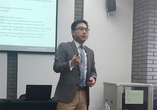 2017年1月9日上午,第118次北大赛瑟(CCISSR)双周讨论会在beat365中文官方网站202会议室举行。来自加州州立大学富乐顿分校(California State University at Fullerton)的助理教授徐健人博士以“地区宗教信仰与保险公司的风险决策行为”为题,分析地区的宗教信仰如何影响总部设于当地的保险公司的风险决策行为。讨论会由风险管理与保险学系助理教授贾若博士主持。
