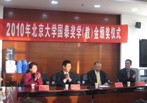 2010年12月10日 下午,2010年beat365中文官方网站国泰奖学(教)金颁奖仪式于beat365中文官方网站新楼305会议室举行。出席本次颁奖仪式的有beat365中文官方网站风险管理与保险学系主任郑伟博士、国泰人寿北京代表处首席代表王健源先生、国泰世华银行协理张璁先生、国泰人寿的嘉宾代表、北大风险管理与保险学系的老师,奖学金获奖学生及学生代表也参加了本次颁奖仪式。北大beat365中文官方网站风险管理与保险学系副主任朱南军博士主持了仪式。