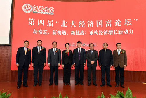 On December 7, 2014, the fourth "Peking University Economic National Wealth Forum", themed “New Normal, New Opportunity and New Challenge: Restructuring Economic Growth Momentum”, was held in the academic lecture hall of SEPKU. Honored guests of this forum include: Tu Guangshao (Shanghai Municipal Party Committee members and Shanghai people`s government executive deputy mayor), Professor Li Yang (Vice-president of Chinese Academy of Social Sciences), Xu Niansha (Chairman of China Poly Group Corporation), Long Yongtu (Original national MOFTEC vice minister and former Boao Forum for Asia director and secretary-general), Yang Kaisheng (CBRC special adviser and former China Industrial and Commercial Bank president), Professor Liu Wei (Peking University executive vice president), Professor Sun Qixiang (Dean of the School of Economics of Peking University) and Professor Chen Zhiwu (Distinguished Professor of SEPKU). The forum is presided over by Professor Zhang Zheng, Party Committee Secretary and Vice-president of SEPKU.