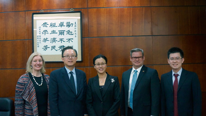 On March 24th, Dr Gene Huang, Vice President and Chief Economist of Abbott, visited SEPKU with Mr. Claude Burcky, Ms. Marie Kissel and Mr. Lv Qiang. Prof. Sun Qixiang, Dean of SEPKU received the guests, accompanied by Dr Qin Xuezheng, Assistant Dean for Foreign Affairs of SEPKU. Dean Sun introduced the general information and more than 100 years’ history of SEPKU brieflyto the guests and presented the signature book <the Chinese Economy in the Eyes of the Ambassador>.