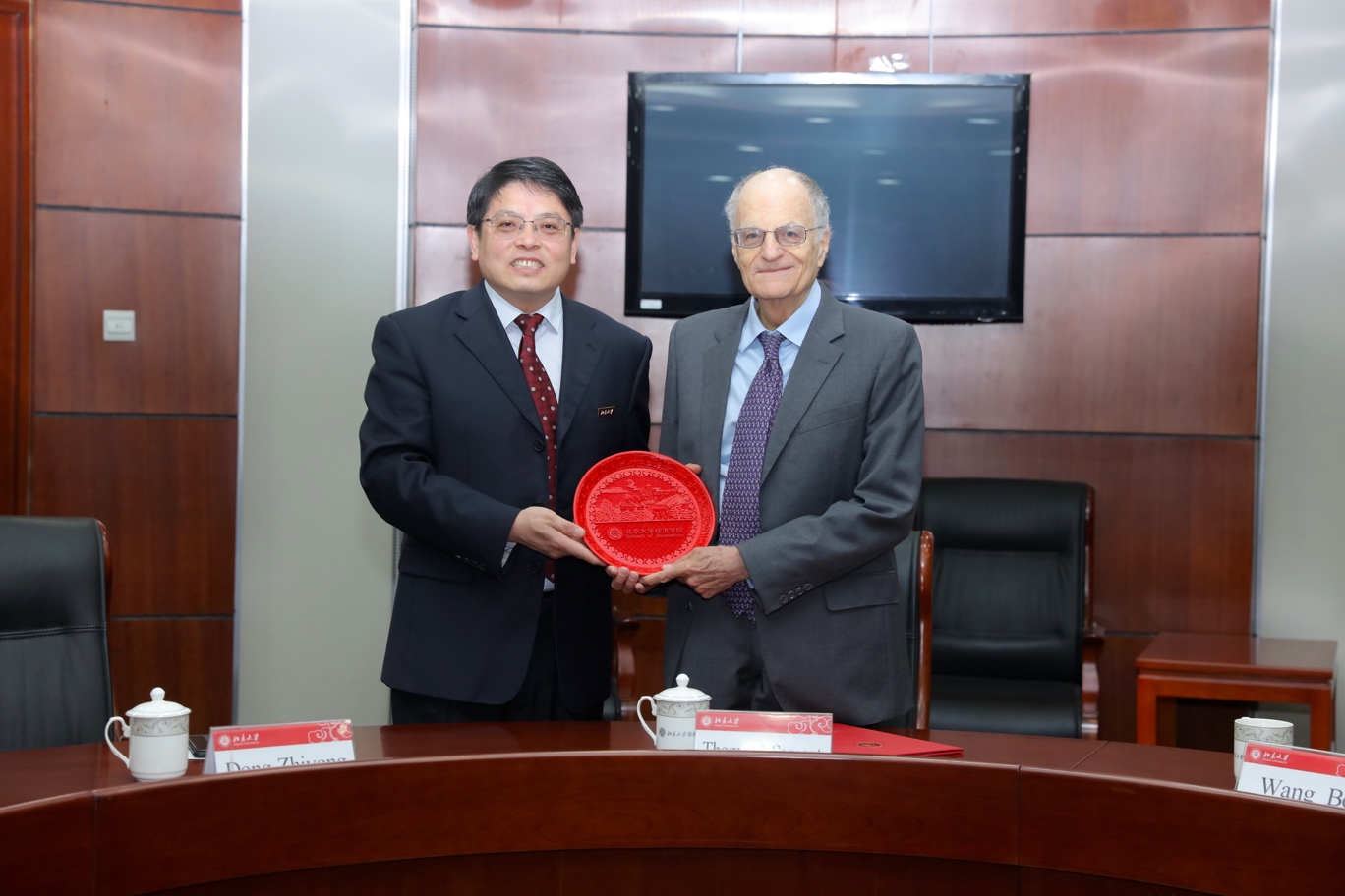 Later, Professor Wang and Professor Dong Zhiyong, Dean of SEPKU, presented Professor Sargent with a certificate and souvenirs. Secretary of the SEPKU Council, Cui Jianhua, Associate Dean of SEPKU, Zhang Hui, Zhang Yaguang, Suo Lingyan, and Qin Xuezheng, Deputy Secretary of the SEPKU Council, Song Fangxiu, and Wang Yiran participated in the ceremony and had a group photo with Sargent.