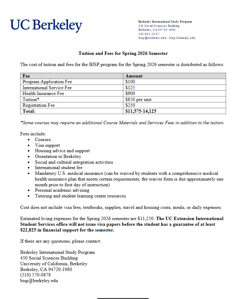 该项目为学生自费项目,学生需向加州大学伯克利分校缴纳相应费用: