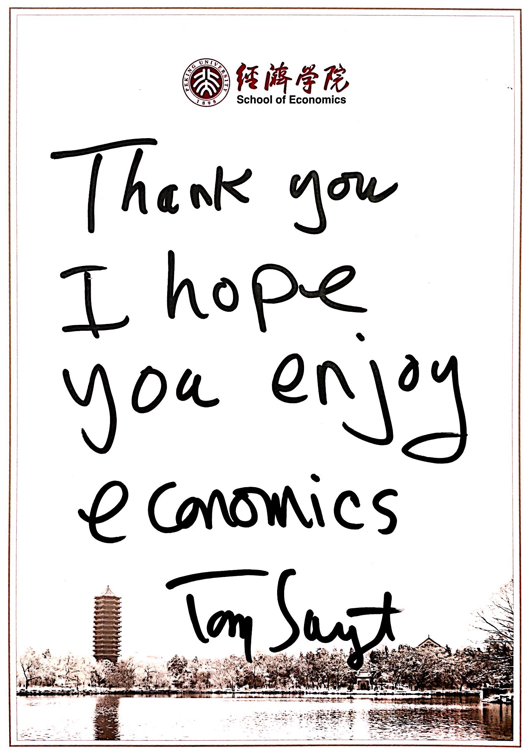 演讲开始前,萨金特教授为学生欣然题词,希望他们能够享受经济学这门学科。