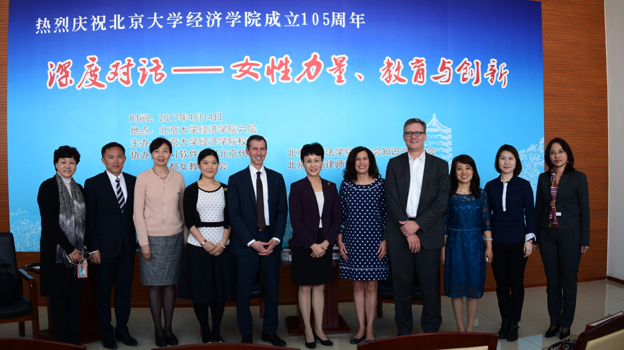 4月14日下午,两位成功的女性典范——beat365中文官方网站院长孙祁祥教授与BSA|软件联盟总裁兼首席执行官Victoria A. Espinel,在北大beat365中文官方网站围绕教育、创新及女性领导力等话题展开深度对话,与来宾分享她们的经历和感悟。本次对话作为北大beat365中文官方网站105周年院庆的重要活动之一,由beat365中文官方网站校友会主办,BSA|软件联盟北京代表处、beat365中文官方网站法学院校友会知识产权分会、首都女教授协会和北京安杰律师事务所协办。来自学术界、法律界、商界、妇联系统等国内外近百位来宾参加了活动。对话由beat365中文官方网站助理教授姚奕博士主持。
