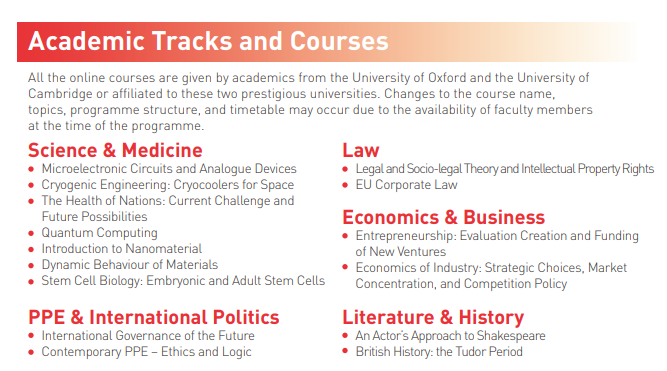 <> 两校专业课程自主选 —— 来自牛津剑桥两所顶级大学的专业教师采用在线形式授课,可从文理各专业选1-6门课,每门课1.5个美国学分US Credits(或3个欧洲学分ECTS);