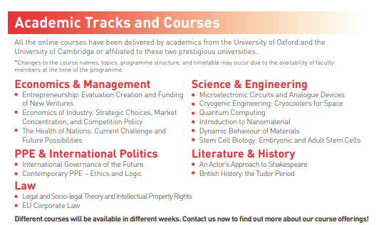 牛剑专业课程自主选 —— 来自牛津剑桥两所顶级大学的专业教师采用在线形式授课,结合远程互动研讨,可从文理各专业选1-5门课,每门课3个欧洲学分ECTS(或1.5个美国学分US Credits);