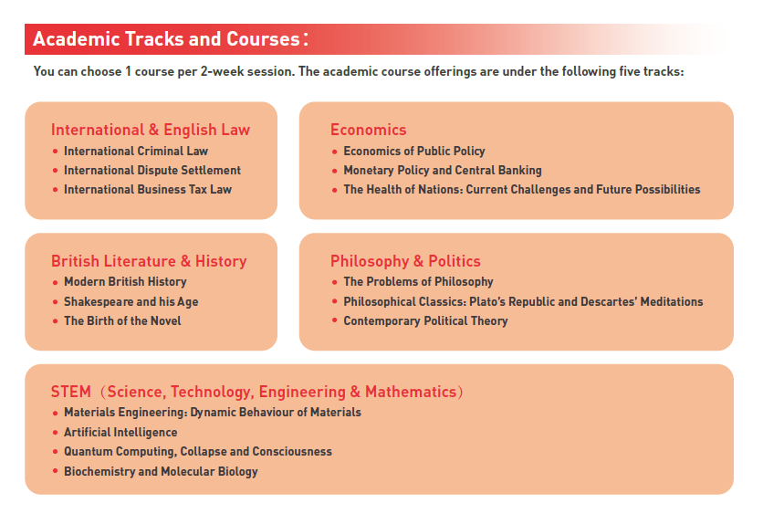 直播专业课程自主选 —— 来自牛津大学奥利尔学院及其他学院的专业教师采用线上与线下同步直播形式授课,结合远程互动研讨,每期可从文理五大板块选1门课,每门课相当于6个欧洲学分ECTS(或3个美国学分US Credits);