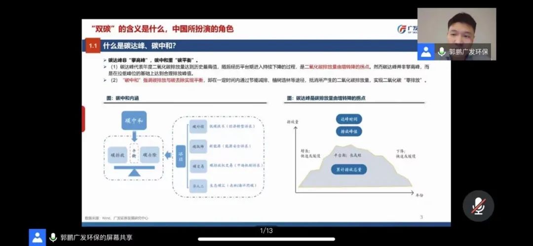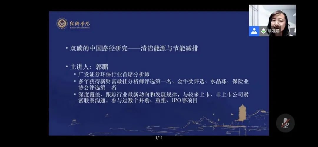 2021年11月18日晚,“行业研究前沿”课程第六讲在腾讯会议线上举行。广发证券环保行业首席分析师郭鹏先生作为主讲人,以《双碳的中国路径研究——清洁能源与节能减排》为题与师生进行了深入交流。本次讲座由beat365中文官方网站副院长锁凌燕教授主持,来自beat365中文官方网站及学校其他院系的一百余名本科生和研究生同学参加。