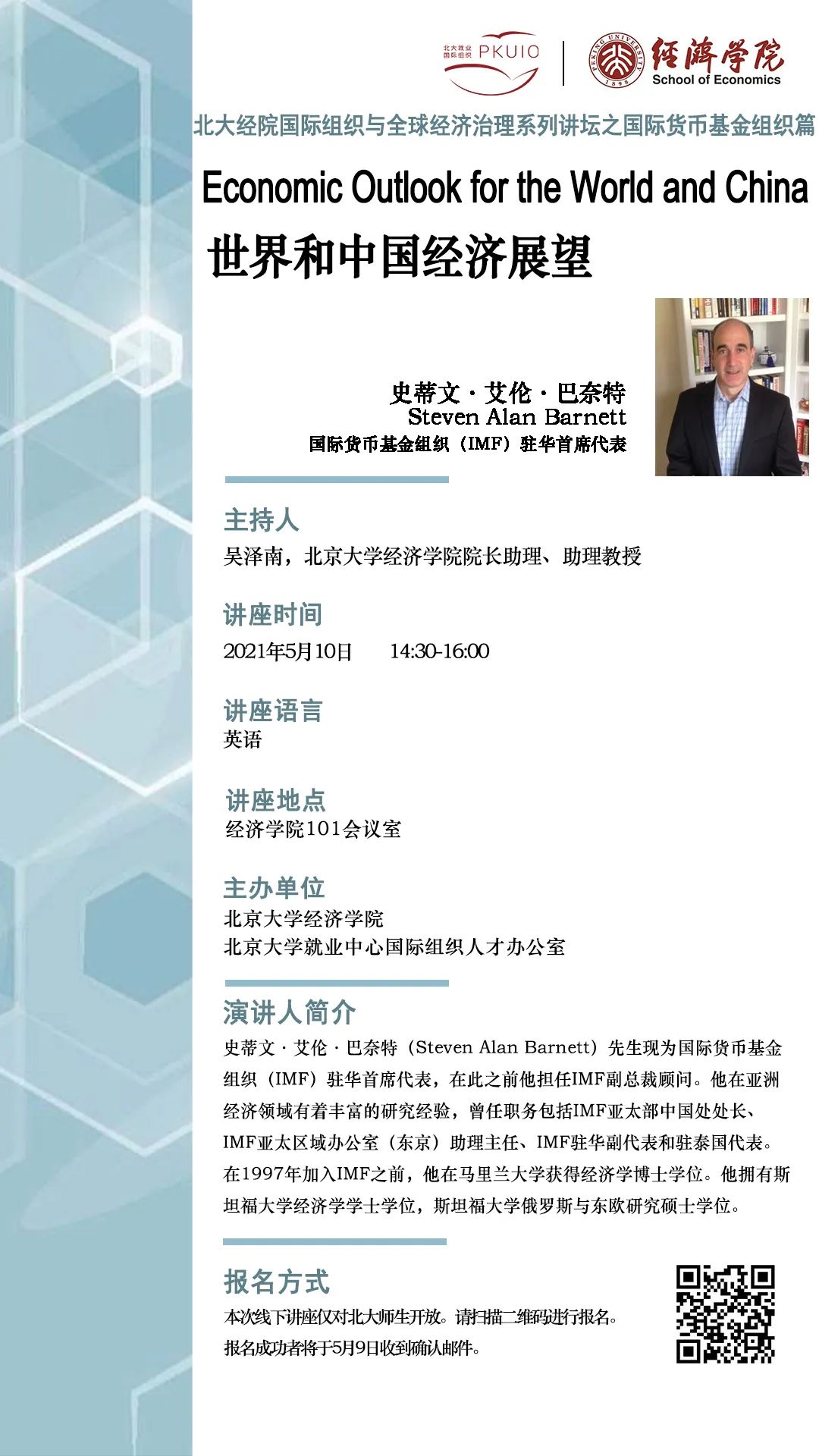 “国际组织与全球经济治理系列讲坛”第一讲已于4月14日开启,来自世界银行的艾卡思(Sebastian Eckardt)博士发表了“中国经济六问”的学术讲座并与在场师生交流;第二讲已于4月23日进行,原世界贸易组织总干事高级顾问塔蒂亚娜·普拉泽雷斯(Tatiana Prazeres)博士与师生畅谈了世贸组织的前景。5月10日,国际货币基金组织(IMF)驻华首席代表史蒂文·艾伦·巴奈特(Steven Alan Barnett)博士将发表学术讲座,与北大师生进行交流,并介绍国际货币基金组织的在华业务及工作机会。敬请期待。