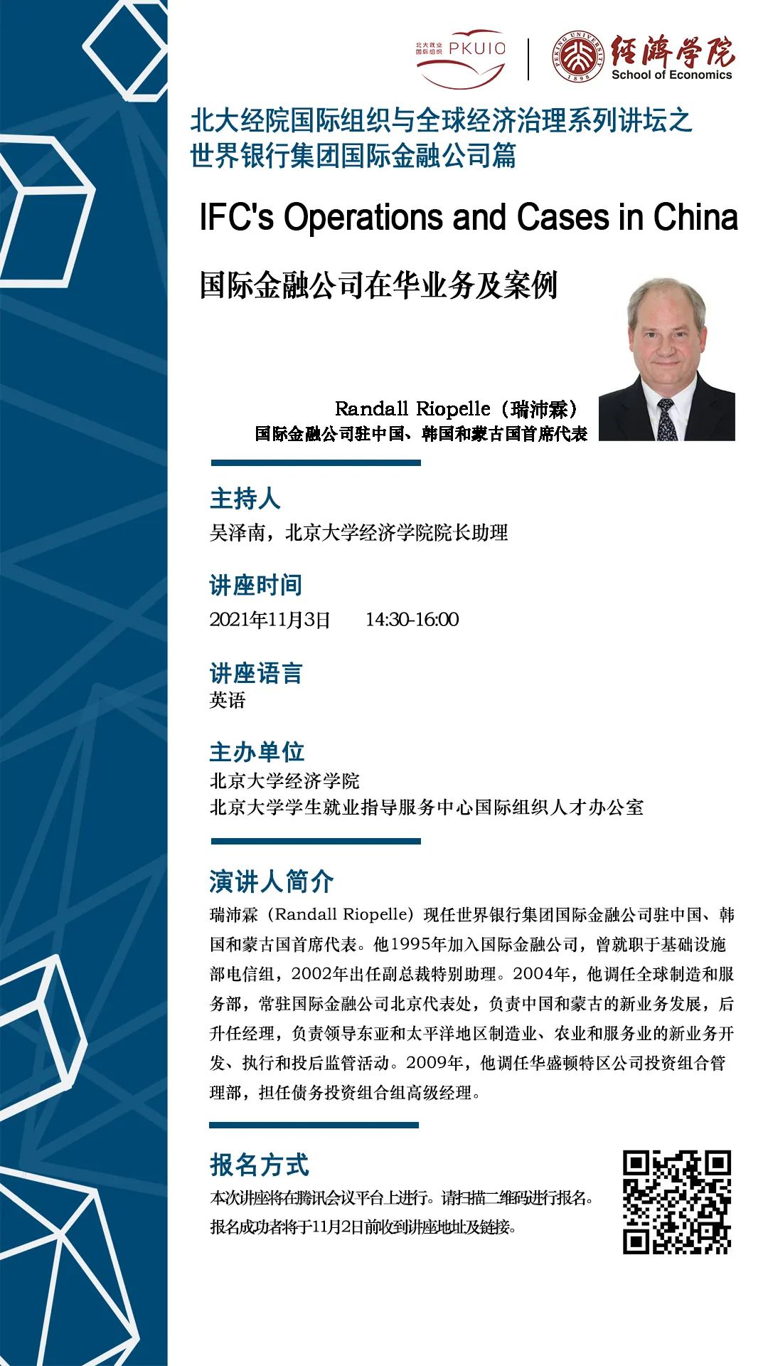 第五讲“国际组织与全球经济治理系列讲坛”将于11月3日在线上举行,世界银行集团国际金融公司驻中国、韩国和蒙古国首席代表Randall Riopelle(瑞沛霖)先生及其同事将带来分享。欢迎参与、敬请期待。
