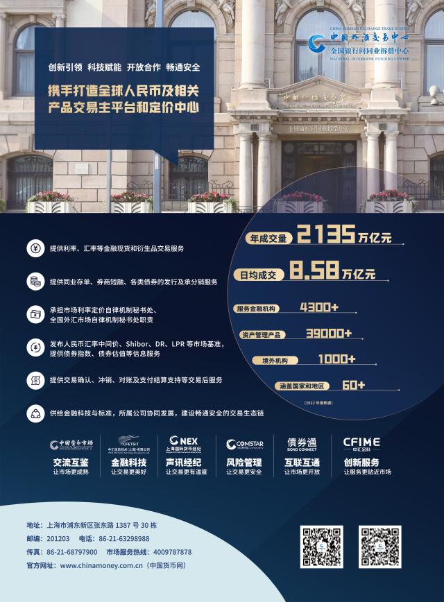 中国外汇交易中心为银行间外汇市场、货币市场、债券市场等现货及衍生产品提供发行、交易、交易后处理、信息、基准和培训服务,承担市场交易的日常监测、利率定价自律机制和全国外汇市场自律机制秘书处工作,为中央银行货币政策操作与传导提供支持和服务,受权发布人民币汇率中间价、上海银行间同业拆放利率(Shibor)、贷款市场报价利率(LPR)、人民币参考汇率等。2022年,银行间市场成交规模超过2000万亿元,本外币市场成员合计超5000家法人机构,分布于全球60余个国家和地区。