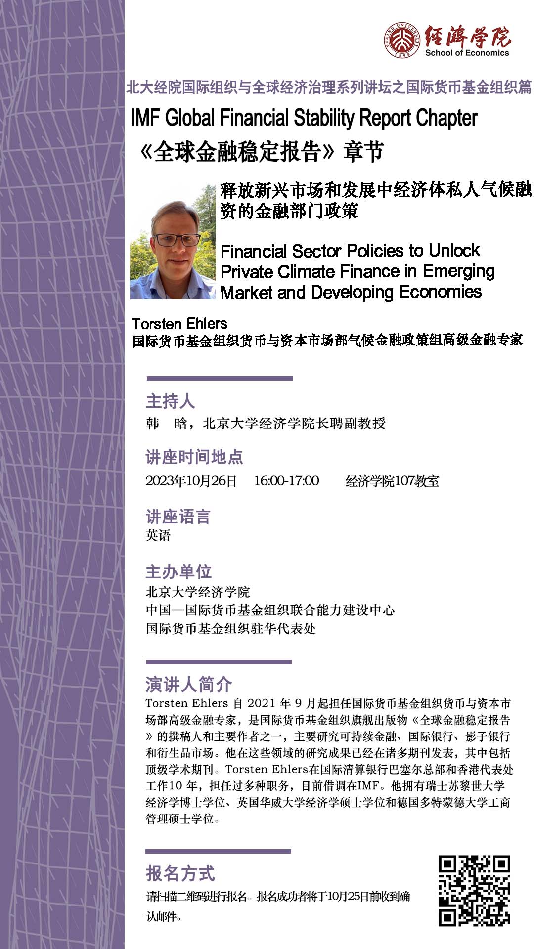 第十一讲“国际组织与全球经济治理系列讲坛”将于10月26日下午在北大经院举行,中国—国际货币基金组织联合能力建设中心主任协调官何晖博士、国际货币基金组织货币与资本市场部气候金融政策组高级金融专家Torsten Ehlers博士等将现场解读国际货币基金组织旗舰出版物《全球金融稳定报告》(IMF Global Financial Stability Report),对世界金融进行分析,并与现场师生进行交流。欢迎参与、敬请期待。