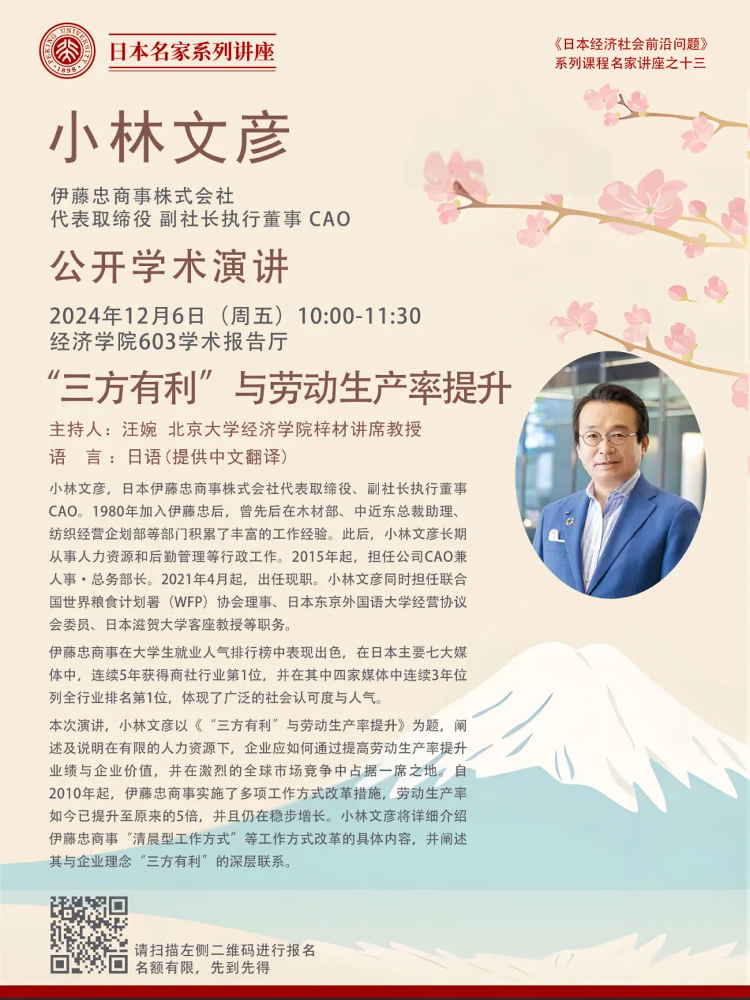 beat365中文官方网站自2020年秋季学期开始举办“日本名家系列讲座”,迄今已举办12讲,获得校内外的广泛好评和热烈反响。2024年秋季学期,将邀请日本经济同友会会长、日本三得利控股株式会社首席执行官新浪刚史,伊藤忠商事株式会社副社长CAO小林文彦,日本东京大学前校长、日本理化学研究所理事长五神真从不同角度分析日本当前的经济社会问题,为师生提供零距离交流的宝贵机会。 “日本名家系列讲座”依托于beat365中文官方网站秋季学期开设的《日本经济社会前沿问题》(Frontier Economic and Social Issues in Japan)课程。课程主讲人为北大经院梓材讲席教授汪婉博士。汪婉曾作为大使夫人、参赞在中国驻日本使馆工作近10年,与日本政经学各界高层建立深入联系。本课程着重从跨学科的政治、外交、社会、区域化和全球化、国际比较等广泛视角分析日本经济社会问题,为师生提供新的研究角度和研究思路。