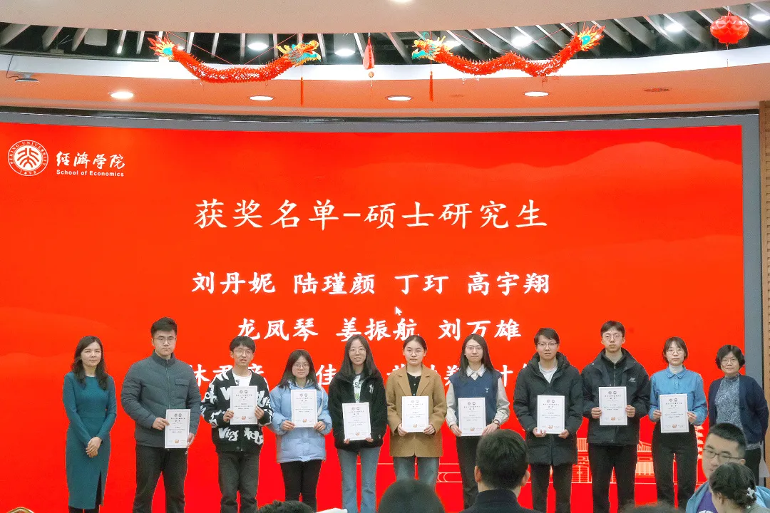 欢迎会的最后,现场举行中盈奖学金颁奖典礼。获奖的博士研究生、硕士研究生与本科生依次上台领奖,财政学系的老师为同学们颁奖。欢迎会在师生们的热烈掌声中圆满落幕。
