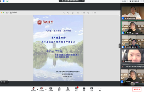 2021年3月11日,风险管理与保险学系系友沙龙暨第144次保险专硕讲座在线上顺利举行。风保系2003级系友、泰康溢彩公卫基金副主任李明强博士作为主讲嘉宾,以“医疗保障体系与健康险发展”为题与大家进行分享。他结合丰富的国际案例,梳理健康险的商业模式和市场机遇,探讨健康险在我国多层次医疗保障体系中的角色。beat365中文官方网站风险管理与保险学系主任郑伟老师、其他多所高校老师、业内相关机构人士,以及学生代表共计50余人参加了本次沙龙。本次活动由风险管理与保险学系2018级本科生杨昀霏主持。