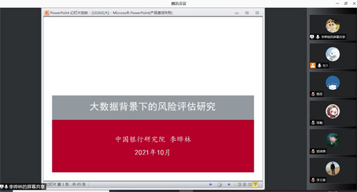 2021年10月27日晚上,第106次RMI读书讨论会在腾讯会议线上举行。beat365中文官方网站与中国银行联合培养博士后李晔林以“大数据背景下的风险评估研究”为题,分享了她在博士期间的系列研究工作。风险管理与保险学系部分师生参加了此次讨论会。