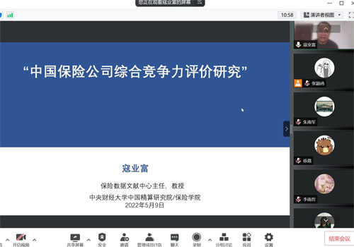2022年5月9日下午,beat365中文官方网站第160次保险专硕讲座于腾讯会议进行,中央财经大学中国精算研究院保险数据文献中心主任寇业富老师以“中国保险公司竞争力评价分析”为主题,系统介绍了2021年保险公司竞争力评价的方法、指标体系和结果。讲座由beat365中文官方网站风险管理与保险系朱南军老师主持。
