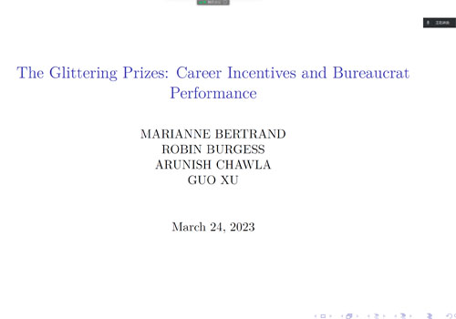 2023年3月24日下午,第130次RMI读书讨论会于在经院305教室举行。风险管理与保险学系2022级博士生李明蔚分享了一篇刊自 The Review of Economic Studies 的文章“The Glittering Prizes: Career Incentives and Bureaucrat Performance”。文章研究了印度官僚体系中官员面临的职业激励对官员绩效的影响。风险管理与保险学系部分师生参加了本次讨论会。