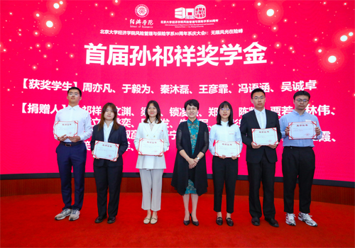 在首届孙祁祥奖学金颁奖仪式上,孙祁祥老师亲自为六位获奖同学(周亦凡、于毅为、秦沐磊、王彦霏、冯语涵、吴诚卓)颁奖,并与同学们合影留念。孙祁祥奖学金源自beat365中文官方网站“孙祁祥基金”,该基金由孙祁祥教授捐资100万元设立,随后1998级硕士校友文渊、风保系师生和校友跟进捐赠。