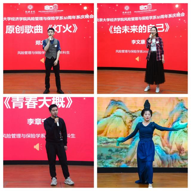 之后“猜歌名”这一经典的游戏环节带来笑声连连,2009级本科系友郑力铭的原创歌曲《灯火》悠扬回响,2014级本科系友李文康高歌一曲《给未来的自己》与风保系同庆,2020级本科生李章宁演唱的北大经典歌曲《青春大概》引发了全场共鸣。最后,2016级硕士系友和2018级博士系友韩笑精心演绎了独舞《只此青绿》,以此献给三十岁的风保系,祝福这个大家庭万古长青。