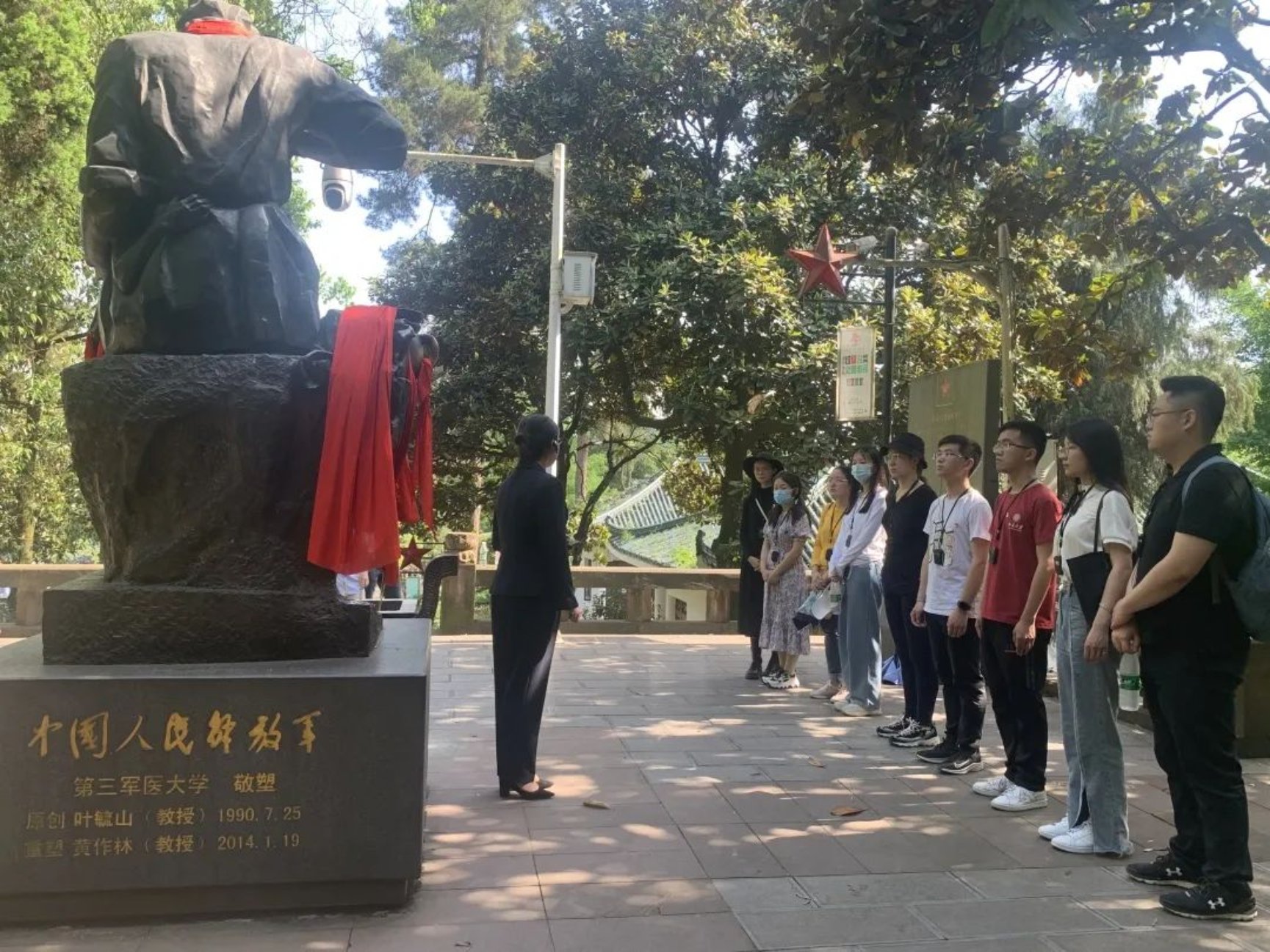 行程的最后,实践团一行来到位于凤凰山上的遵义红军烈士陵园,缅怀在遵义牺牲的红军烈士,汲取奋勇拼搏的精神力量。1949年11月21日遵义解放后,遵义市人民政府清理了1935年初在遵义战役中牺牲的红军烈士遗骸,先后找到了19位烈士。1958年,遵义人民在松子坎找到了牺牲在遵义城外的邓萍将军遗骸,并修建遵义红军烈士陵园,将将军和其他烈士安葬于此。师生沿着300多级台阶拾级而上,向邓小平同志题写的红军烈士纪念碑敬献花篮,并向在遵义壮烈牺牲的红军烈士深深三鞠躬。随后,在讲解员的深情讲解下,大家在当地著名的“红军坟”前学习了红军卫生员龙思泉烈士的光辉事迹,体会到了遵义人民对红军的深切感情。