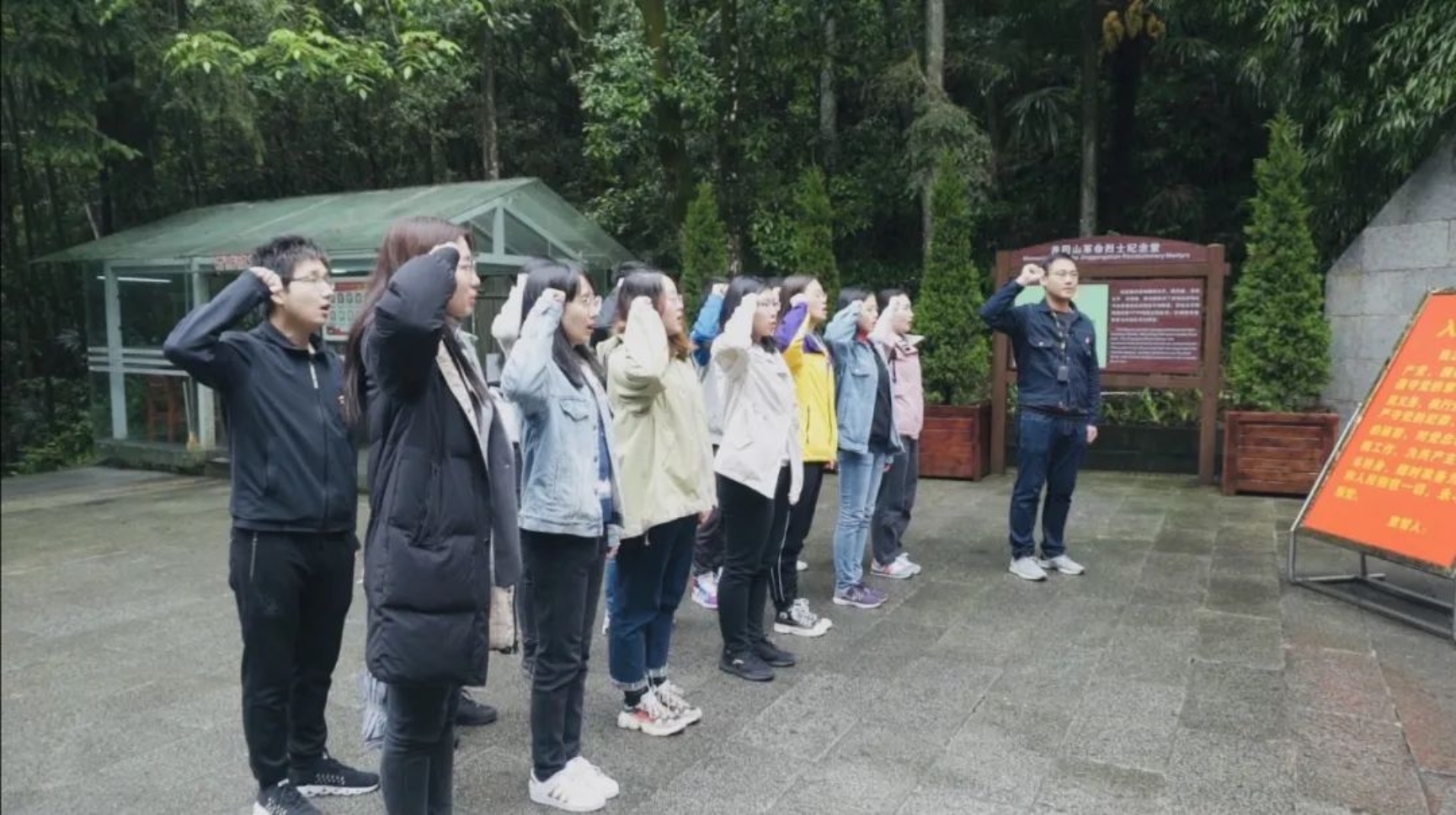 在黄洋界,师生仔细参观革命遗迹,透过一条战壕和一架山炮,了解黄洋界保卫战从“敌强我弱”到“以少胜多”的战斗奇迹;瞻仰一首名篇和一座丰碑,感受红军队伍“依靠群众”的坚定初心和“勇于胜利”的宏伟气魄。“山下旌旗在望,山头鼓角相闻,敌军围困万千重,我自岿然不动;早已森严壁垒,更加众志成城,黄洋界上炮声隆,报道敌军宵遁。”在讲解员的带领下,师生列队于纪念碑前,集体朗诵《西江月·井冈山》,铿锵有力的豪迈词句响彻于黄洋界上,众志成城的革命精神铭刻在每个人心间。