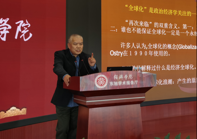 讲座开始,崔建华提出,经济全球化时代早已再次来临。他从经济学思想与地理空间两个维度分析经济发展产生差异的原因,并阐释“再次来临”的内涵。崔建华指出,各国(地区)经济的依赖关系在历史上早已存在,此外全球化格局并非一定永久存续,存在高峰与低潮的波动。