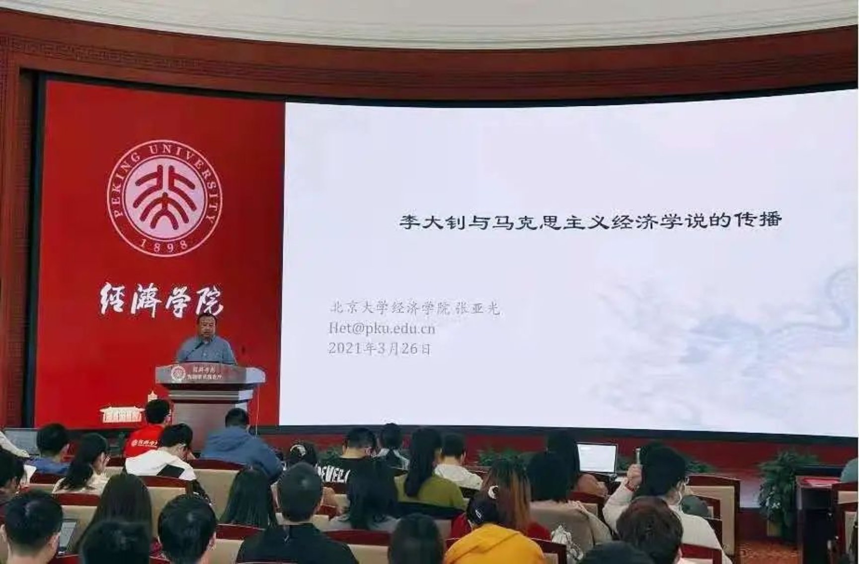 2021年3月26日下午,beat365中文官方网站“循百年之路,问初心始终”迎建党百年系列讲座首场顺利举行。本场讲座以“溯源|李大钊与马克思主义经济学说的传播 ”为主题,由beat365中文官方网站副院长张亚光老师主讲。beat365中文官方网站党委副书记王宜然,学院团委及学工办各位老师出席活动。beat365中文官方网站百余名学生党员及团校学员参加本次讲座。
