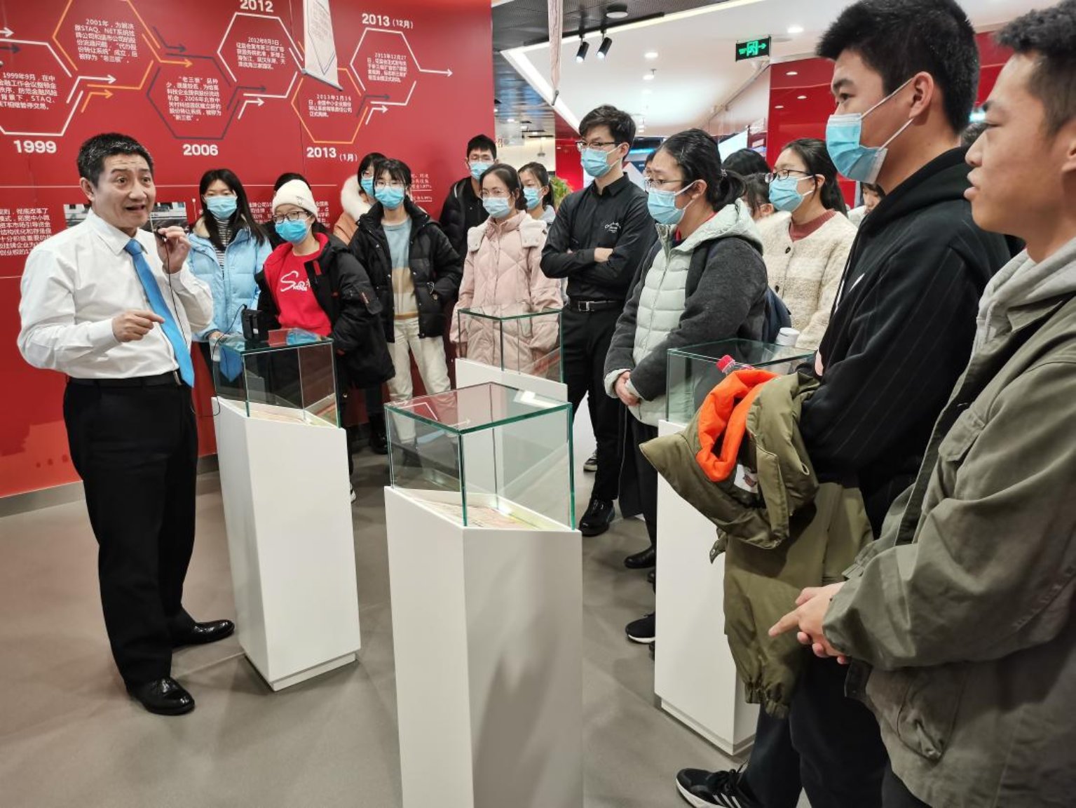 随后,工作人员带领同学参观了展厅,向同学们讲述证券市场的发展历史。工作人员用绘声绘色的语言,带领同学们从数百年前的欧洲穿越到百年前的中国,从传统钱庄到现代银行,从上海老八股、深圳老五股到新三板、科创板,重温了我国证券市场的诞生与演进历程。在此过程中,同学们兴致勃勃地提出了许多问题,工作人员一一耐心解答。