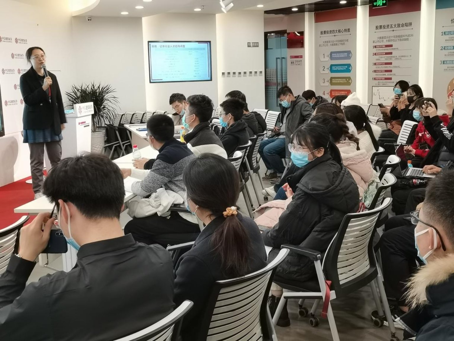 看毕展览,中信建投人力资源副总裁王天乐向同学们介绍了证券市场的职业方向、就业前景与人才要求。她向同学们展示了证券市场多样的就业领域和广阔就业前景,并从证券人才分布趋势的变化出发,带同学们初步了解了证券市场内部各职业的具体职务。证券行业对从业人员的知识储备、行业经验、外语能力及计算机水平均有较高要求。她建议同学们多浏览各大头部公司招聘要求,以更好把握相关岗位对求职者能力、经历的要求。王天乐还回答了同学们对实习、求职等的疑问,鼓励同学们打牢知识基础,有针对性地进行实行。