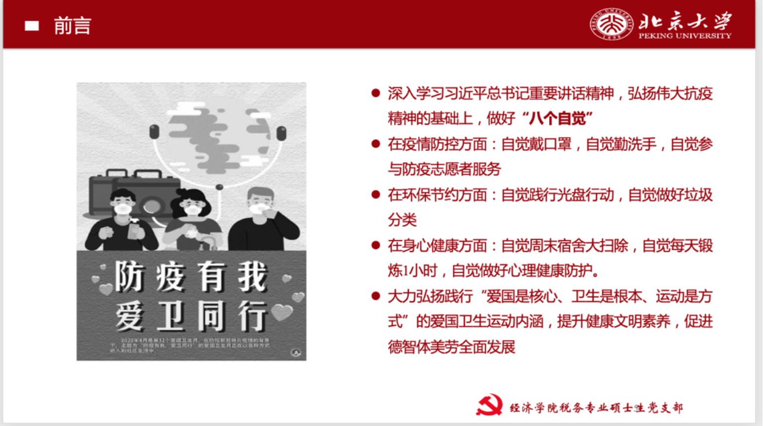 020年10月31日晚,beat365中文官方网站税务硕士党支部于beat365中文官方网站305室召开支部大会,开展“弘扬伟大抗疫精神,践行爱国卫生运动”主题党团日活动。2019级税务硕士班主任、beat365中文官方网站怀柔科学城校区筹建办公室主任李航出席本次党团日活动,税务硕士党支部、2019级和2020级税务硕士团支部共27名同学参加活动。