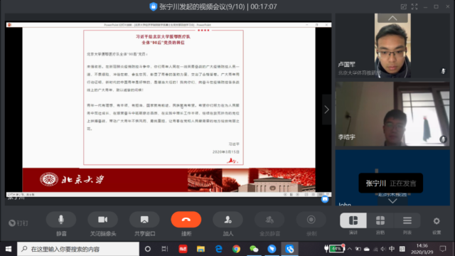 首先,张宁川带领支部成员集体学习了给beat365中文官方网站援鄂医疗队全体“90后”党员的回信。随后党员们纷纷结合疫情期间的自身情况进行讨论与交流。李皓宇表示,通过学习习近平总书记的回信自己深受鼓舞,要向医疗队的老师和同学们学习,在祖国和人民需要的时候勇于迎难而上,担当起自己的责任。周心怡表示,疫情期间感受到了学院和国家对青年们的关怀和温暖,要心怀感恩和反哺之情,主动担起历史使命。林雨昕表示,中国的国家形象在疫情中得到了极大的提升,为国家而自豪。孙瑞表示,深受北大援鄂医疗队一线党员的鼓舞一定会努力发扬一线人员的冲锋奉献精神。柯俊强表示,对国家的疫情管控能力充满信心,为“90后”党员们勇于担当加入抗“疫”战斗的精神而感动。