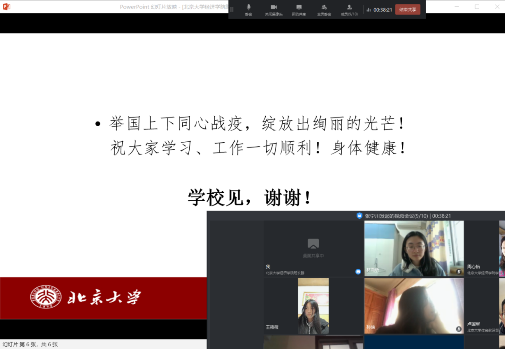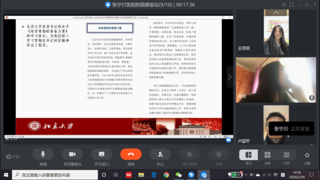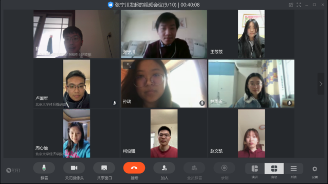 家在湖北的两位党员同志卢国军和王筱筱也结合疫情期间自身经历谈了感受。卢国军表示,作为一名湖北人,疫情以来一直感受到学校、学院以及党支部的关怀,他以北大的医疗队为榜样,积极参加了基层党支部的工作,协助他们把入户调查的统计信息录入防疫系统。王筱筱目前仍在家乡湖北省十堰市,她表示,“90后”是可担当重任的,定将不负习近平总书记的殷切期望,发挥模范带头作用,践行党员义务,为社会和国家奉献自己一份力量,同时表示学院多次寄来物资让人倍感温暖,非常感谢学院和党支部的关心。