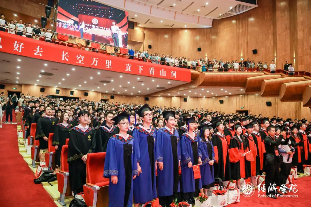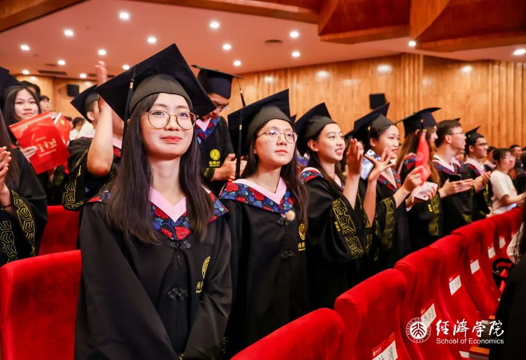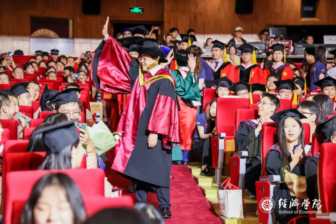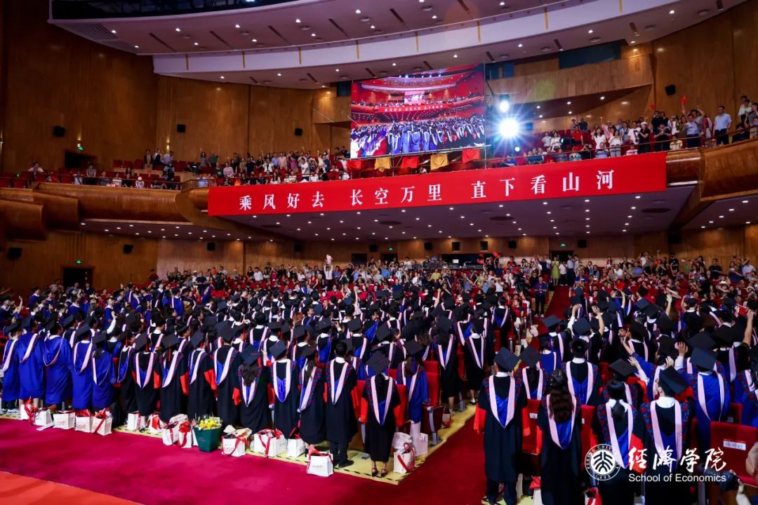 当象征着学院的巨幅旗帜缓缓展开,毕业生们高举双臂,托起这面旗帜,扛起北大经院人的责任担当。经院魂在这里生长,它期待并期许毕业生们不滞于物、不殆于心;北大魂在这里生长,它期望并期盼毕业生们成长为时代中坚、国之栋梁。