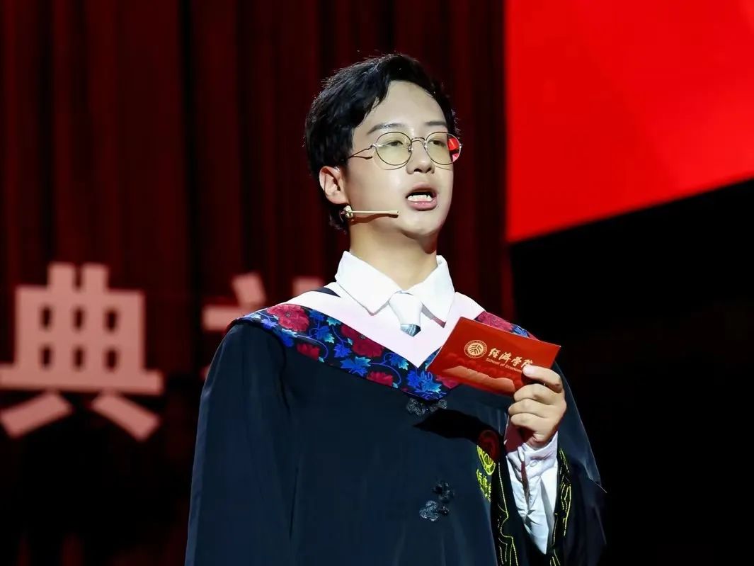 “携手千山万水,行至盛夏灿烂”,典礼如约而至。鼓钟将将,钟音朗朗;三声钟鸣,震彻心扉。“乘风好去,长空万里,直下看山河”,戏腔唱响,响彻大厅;京剧联排,惊艳全场。深藏在血脉中的文化基因,在花枪的舞动中觉醒,在字正腔圆的演唱中传承。北大2023届硕士毕业生江宇梁带来《梨花颂》,委婉大气,回味悠长。