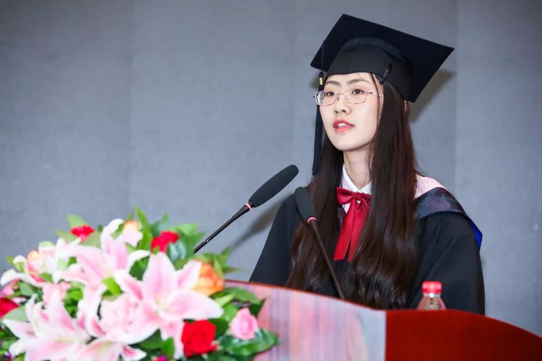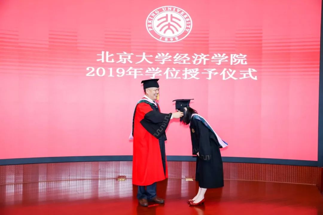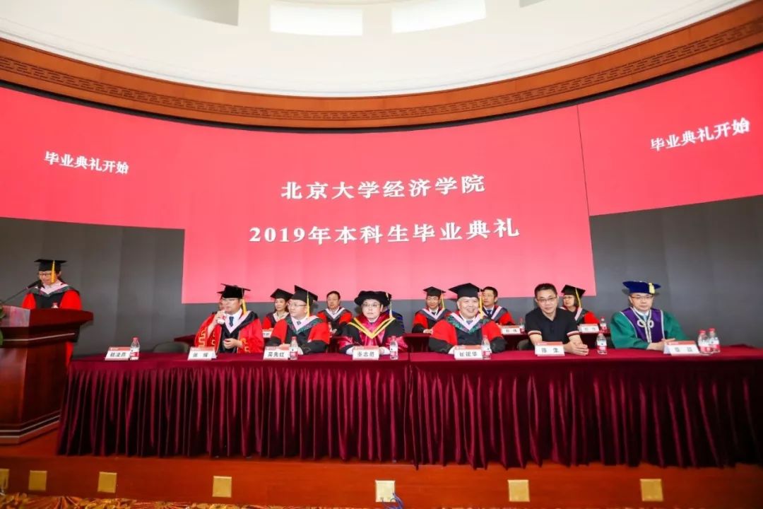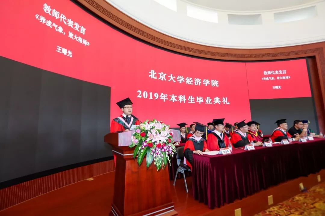 随后,2019届毕业生毕悦作为毕业生代表发言。她深信燕园四年的洗礼为每一位毕业生留下了共同的精神印记,是对真理的渴望,对信念的追寻,是驽马十驾、功在不舍的坚守,是经世济民、修齐治平的担当。她呼吁每一位毕业生时刻谨记作为“北大人”“经院人”的责任与信念。最后,她感谢父母的养育之恩,感谢师长的勤勤恳恳,并以梁任公的“红日初升,其道大光;河出伏流,一泻汪洋;纵有千古,横有八荒;前途似海,来日方长”与全体毕业生共勉。