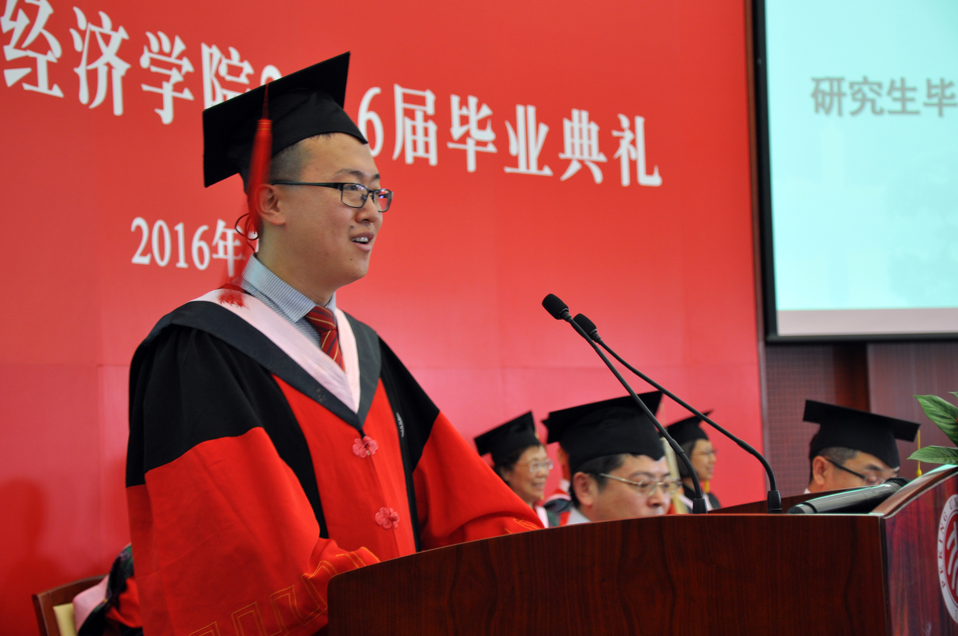王圣博、杜浩然分别代表毕业本科生、研究生发言。王圣博深情回顾了燕园四年中学习成长的点点滴滴,表达了对父母师长的感激以及身为当代青年经济学子经世济民的担当与理想。杜浩然则以“牢记给予,勿忘回报”为主题,强调北大经院给予了毕业生们丰富的学术知识、全面的素质训练和深切的人文关怀,呼吁同学们牢记师长父母的教诲,锐意进取,笃定前行,肩负起时代赋予的神圣使命。
