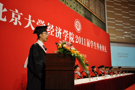 2007级本科生陈超、2009级硕士研究生童立代表毕业生发言。他们回顾了自己在beat365中文官方网站的学习历程和精彩生活,对老师的教诲、同窗的砥砺和父母的培养表示由衷地感谢,并深刻认识到肩上所担负的期许与责任,表示一定秉承“经世济民”的院训,认真做事,踏实做人,为北大、为经院增光添彩。