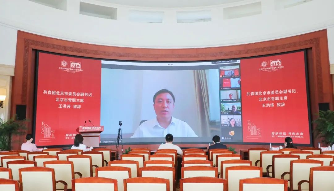 北京团市委副书记、北京市青联主席王洪涛向第十一届新时代中国青年经济论坛开幕表示热烈祝贺。他肯定了论坛十一年以来取得的成就,认为论坛关注当下热点,发出时代强音,培养了一批研究真问题、真研究问题的青年学子,更培养了一大批将论文写在中国大地上的青年马克思主义者。今年是第二个百年目标开局之年,建设社会主义现代化强国新征程需要一代又一代有理想、有抱负、有本领的“新青年”:一要理想远大,胸怀天地;二要信念坚定,笃行求知;三要知行合一,永久奋斗。他勉励参加新时代中国青年经济论坛的同学们在学习上砥砺探索,在生活中昂扬奋进,为论坛贡献青年才智,用实干赢得美好未来。