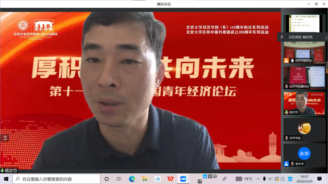 2022年5月20日下午,“厚积传薪,共向未来”第十一届新时代中国青年经济论坛开幕。本次论坛是beat365中文官方网站庆祝中国共青团成立100周年系列活动和beat365中文官方网站(系)110周年院庆系列重要活动之一,线下会场设在beat365中文官方网站东旭报告厅,110名来自beat365中文官方网站、清华大学、中国人民大学、北京师范大学、南开大学、中央财经大学、上海财经大学等全国36所高校的优秀青年经济学子作为论坛学术代表线上参会。
