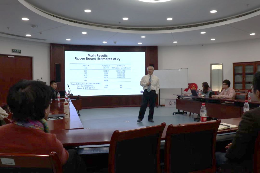 曾郁仁教授首先回顾了随机占优的定义,进而引入了几乎随机占优的概念。曾教授通过直观数值例子指出几乎随机占优意味着决策者可以接受对随机占优分布多大程度上的违反,并通过严格数学证明推导出了“违反率”这一核心参数。和以往的文章主要通过实验的方法来确定“违反率”不同,曾教授及其合作者收集了台湾2002-2008的汽车盗窃险购买数据,使用大量实际数据估计“违反率”。他们的估计结果表明99%(95%)的决策者违反率的上界为0.0399(0.0727)。