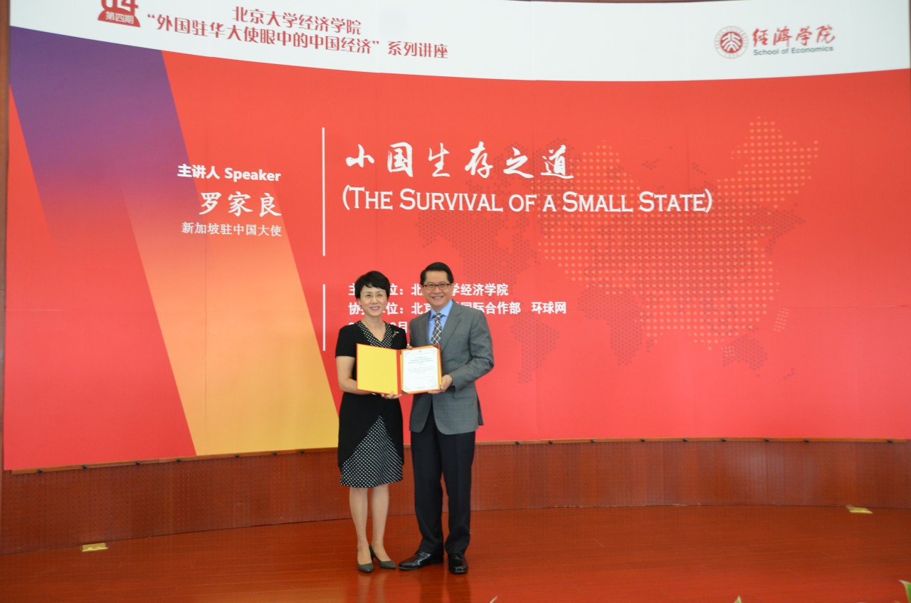 6月15日上午,新加坡驻中国大使罗家良一行来访。作为北大beat365中文官方网站“外国驻华大使眼中的中国经济”系列讲座的演讲嘉宾,罗家良大使在beat365中文官方网站东旭学术报告厅以“小国生存之道”为题发表了主题演讲。