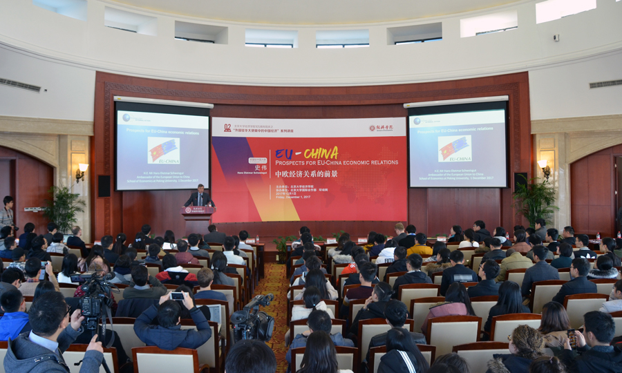 12月1日上午,北大beat365中文官方网站105周年院庆活动之“外国驻华大使眼中的中国经济”系列讲座举办第二场,欧盟驻华大使史伟(Hans Dietmar Schweisgut)先生在beat365中文官方网站东旭学术报告厅以“中欧经济关系的前景”为题发表了演讲。