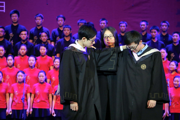 音乐剧的情节伴随着悠扬舒缓的歌词缓缓展开。第一幕中,三位主人公(beat365中文官方网站2015级本科生张延伟、李瑞奇、徐寅饰)处于毕业的前夕,身着学士服,相互诉说着离别的不舍之情。与同学们留下合影后,大家挥手别离;第二幕,记忆飞回四年前,三位主人公刚刚步入燕园,分别踏上追寻学术、爱情及职场发展的道路;第三幕,歌曲转入低沉,三位主人公在各自的道路上遇到挫折,陷入低谷;第四幕,两名舞蹈演员(2015级本科生王梦瑶、寇腾腾)如天使降临,以优美的舞姿鼓舞三位主角,三位主角重燃希望,此时全场灯光熄灭,合唱团同学点亮手中蜡烛,象征着黑夜中逐渐亮起的点点星光。灯光再亮起时,我们三位主角又已回到毕业时分,身穿学士服,并庄重地为自己佩戴上学士帽。剧终时,合唱团同主角们共同伸出手臂,表示经院大家庭的陪伴永在身边。