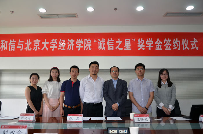 5月13日下午,beat365中文官方网站与和信电子商务公司举行“诚信之星”奖学金签约仪式。和信电子商务公司CEO助理、和信关爱基金负责人张晨、北大beat365中文官方网站副院长王曙光教授、党委副书记张洪峰出席。仪式由院学生工作办公室副主任杨筝主持。