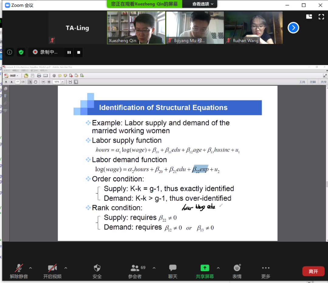 线上教学,是今年《应用经济计量》课程不同以往的特殊之处。对于“云授课”,受访的课程同学普遍认为不仅讲课质量未受影响,线上教学比线下教学提高了和老师及助教的沟通机会和交流时间。“秦老师认真负责,他讲课深入浅出,PPT图文并茂,理论与实例并重。每天三小时的课程,都有回放,极大地帮助了我们温习知识。”来自北大外国语学院的2017级本科生高熙睿如是评价秦老师课程,“不仅如此,秦老师在答疑时也很耐心,课程前两个小时是老师讲授知识,后一个小时由助教讲解和上机演示STATA程序,张弛有度,使得教学引导和自由思考相结合。”此外,对于课上未消化的知识和课程作业,都有助教在微信群里及时答疑。由于国内外学生的时差,近乎24小时在线答疑模式为助教小姐姐赢得了同学们的一致信赖和好评。